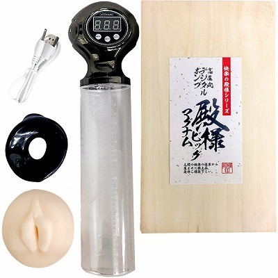 快楽の追求から生まれた極上の逸品!快楽の殿様シリーズが贈る高圧式の電動ペニスポンプ。●品格漂う桐箱風パッケージ入り●目視&操作簡単なデジタル表示●細かい目盛り付きのシリンダー●USBの電動バキュームで高圧吸引●リアルな挿入口パーツも付属。日々のトレーニングで殿様級のビッグマグナムに♪リアルな挿入口と高圧バキュームにより、チントレと同時に快感も得られるペニス増大グッズです。